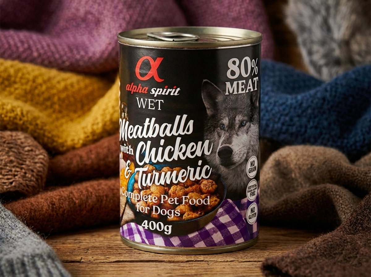 Alimento húmedo completo en formato albóndigas, gama Super Premium (Meatballs with Chicken & Turmeric), elaborado con 80% de carne fresca (50% pollo y 30% cerdo como proteínas principales). Es sin cereales (grain free), sin gluten y sin harinas cárnicas, con proteína media (9,3%) y grasa baja (5,5%), ideal para perros con digestión sensible. Enriquecido con cúrcuma de acción antiinflamatoria y con vitaminas y minerales esenciales que refuerzan defensas y vitalidad. Textura jugosa y muy digestible gracias a su cocción suave. Apto para perros adultos y senior de todas las tallas, con actividad sedentaria o normal. Apto para esterilizados, por su perfil bajo en grasa y proteína moderada. Diccionario NaturPatitas.