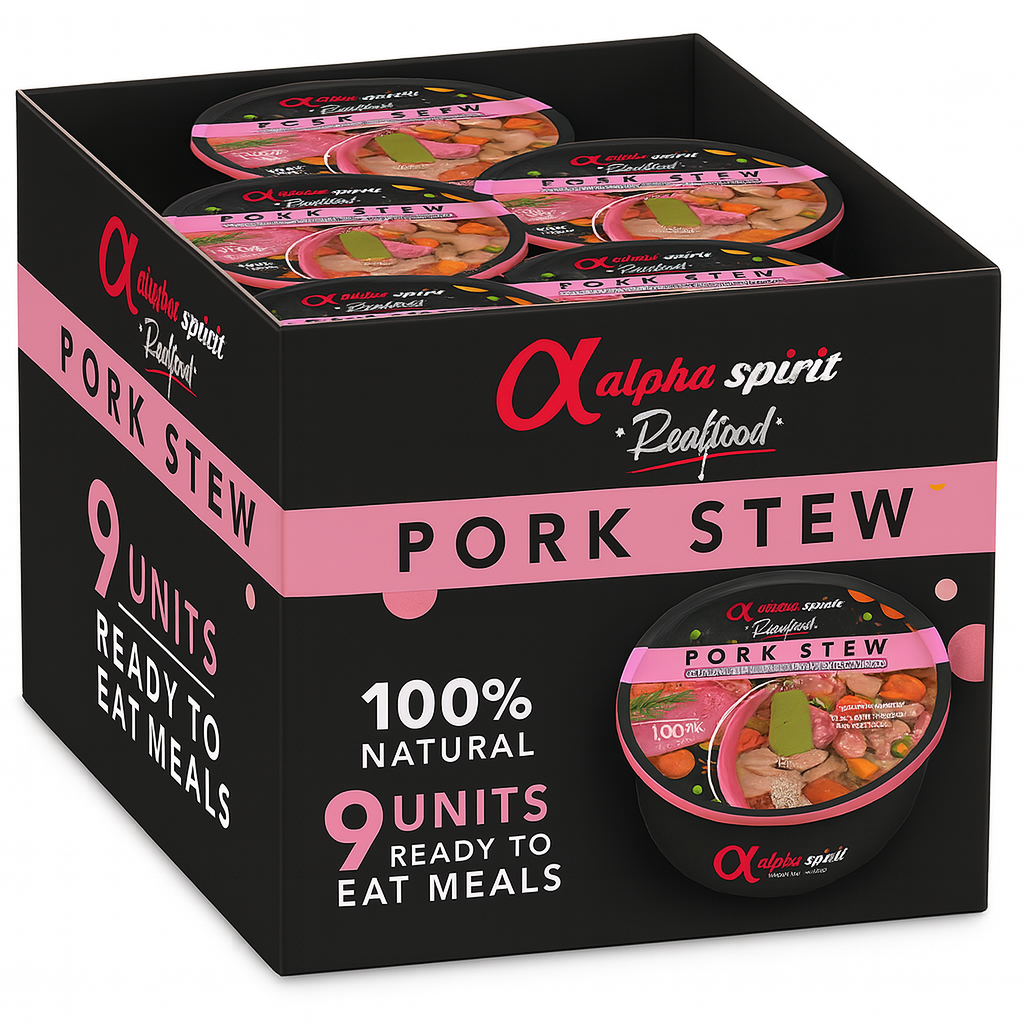 Alimento húmedo completo monoproteico de gama SUPER PREMIUM (Real Food Pork Stew) para perros adultos y senior de todas las tallas, elaborado con 97% de cerdo fresco como única proteína animal. Es sin cereales (grain free) y sin gluten, ideal para perros con alergias o estómagos sensibles, con proteína media (12,3%) y grasa moderada (8,2%) que aportan energía equilibrada. Incluye vitaminas y minerales esenciales para reforzar defensas y vitalidad. Su textura jugosa cocinada a baja temperatura garantiza alta palatabilidad y digestibilidad. Apto para perros esterilizados, ya que su perfil nutricional ayuda a controlar el peso. Diccionario NaturPatitas.
