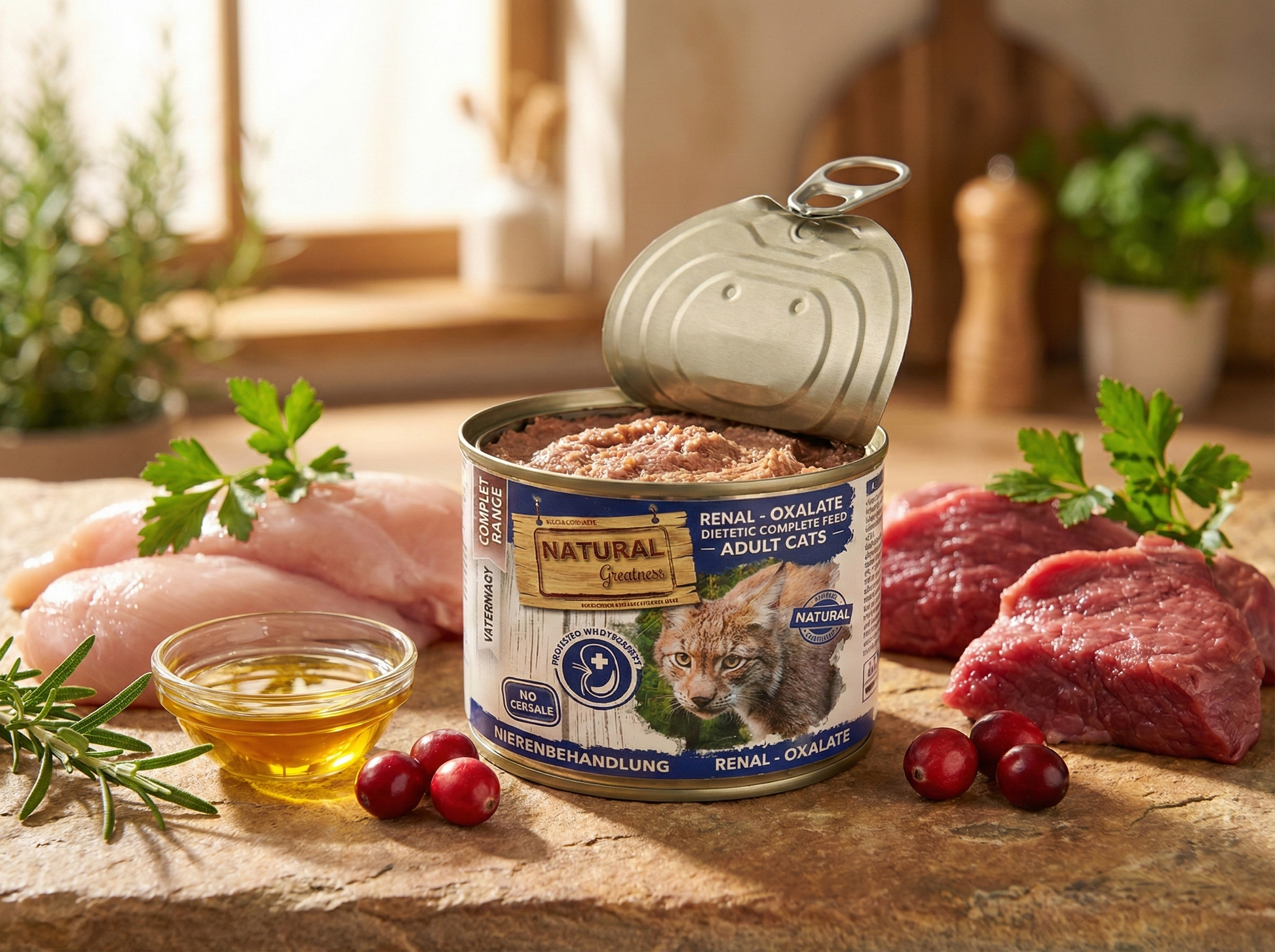 Alimento húmedo dietético completo de gama Super Premium (Dieta Veterinaria Renal - Oxalate), formulado sin cereales y hipoalergénico, con pollo (33%) como primer ingrediente y proteínas de pollo y vacuno. Con proteína baja (6,7%), fósforo y sodio reducidos, está indicado para gatos júnior, adultos y senior con insuficiencia renal crónica (IRC) y para prevenir la reaparición de cálculos de oxalato gracias al citrato potásico que alcaliniza la orina. Enriquecido con Omega 3 y 6 y taurina, favorece la salud renal, urinaria, ocular, cardiovascular y el pelaje. Apto para esterilizados por su perfil equilibrado. Uso bajo supervisión veterinaria. Diccionario NaturPatitas.
