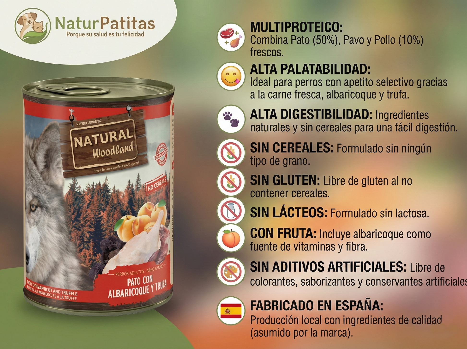 Alimento completo húmedo Premium (Pato con Albaricoque), elaborado con 50% carne fresca de pato como primer ingrediente y complementado con pavo y pollo (10%). Es multiproteico, con proteína media (8%) y grasa moderada (6,5%), formulado sin cereales (grain free), sin gluten, sin lácteos ni aditivos artificiales. Incluye albaricoque y trufa que aportan sabor, fibra y vitaminas, favoreciendo la digestibilidad y la palatabilidad. Indicado para perros adultos y senior de todas las razas y tamaños, con cualquier nivel de actividad. Apto para esterilizados gracias a su perfil equilibrado. Diccionario NaturPatitas.