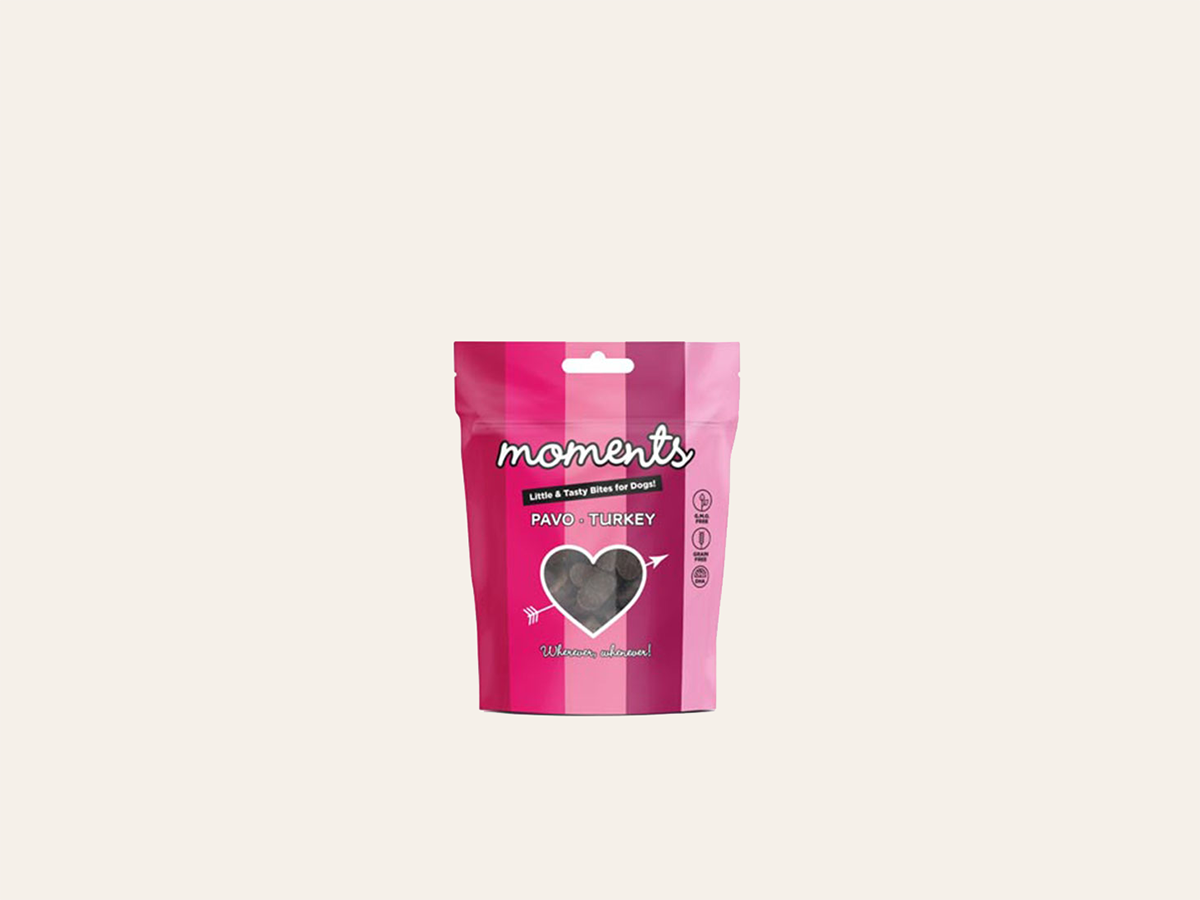 Snack semihúmedo complementario de gama Super Premium (Moments Turkey), elaborado con pavo fresco (70%) como único ingrediente animal (monoproteico). Es sin cereales (Grain Free), con proteína alta (23%) y textura blanda de gran palatabilidad. Aporta Omega 3 (DHA) para el soporte cognitivo, antioxidantes naturales y beneficios para piel y pelaje. Ideal como premio nutritivo para cachorros, junior, adultos y senior, así como para perras gestantes o lactantes de todas las razas y tamaños. Apto también para esterilizados por su perfil proteico alto y equilibrado en grasa.